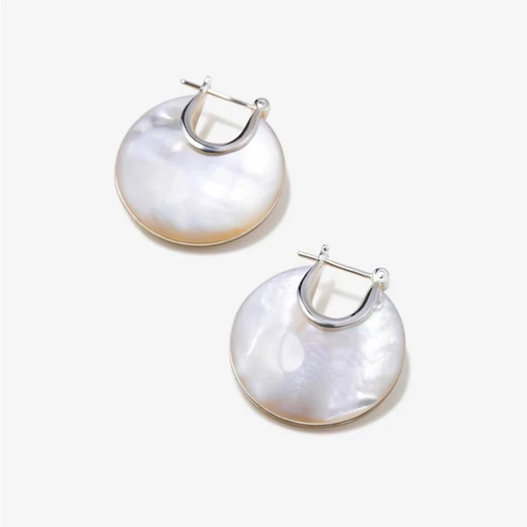 Elevate your look with these Mother-of-Pearl Disc Hoop Earrings—where minimalist design meets natural elegance. Each earring features a gently curved sterling silver U-bar that suspends a luminous, 25 mm mother-of-pearl disc. The discs’ iridescent sheen reflects soft pastel hues in any light, ensuring every pair is uniquely beautiful.