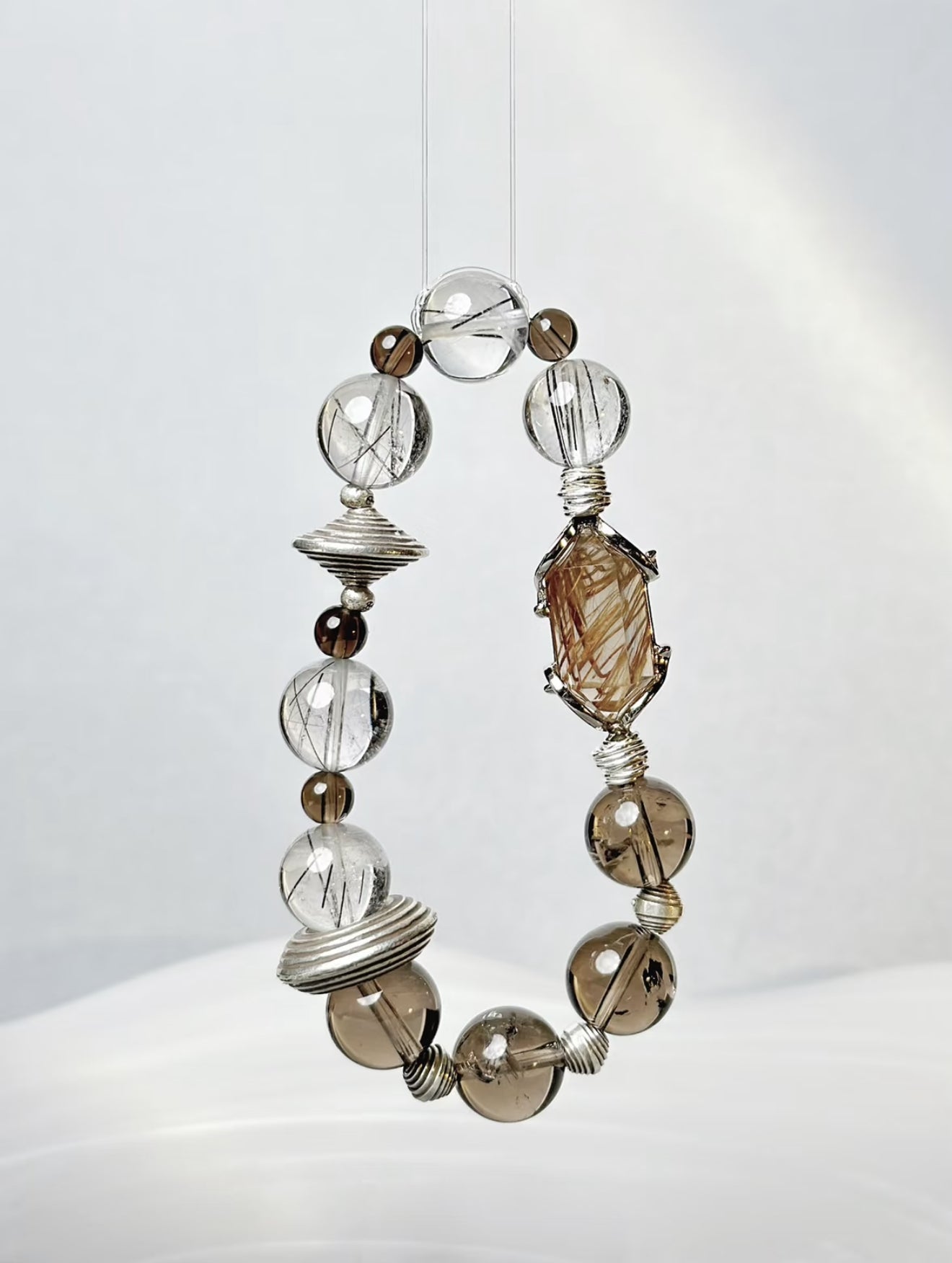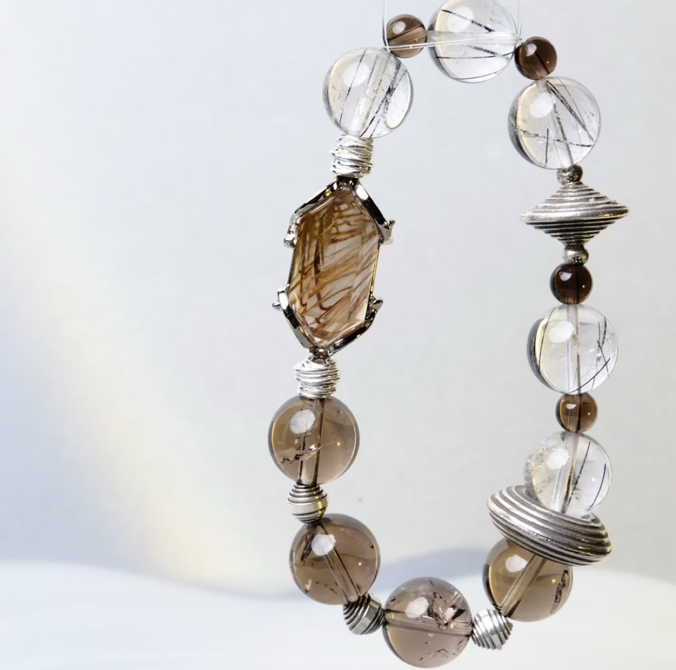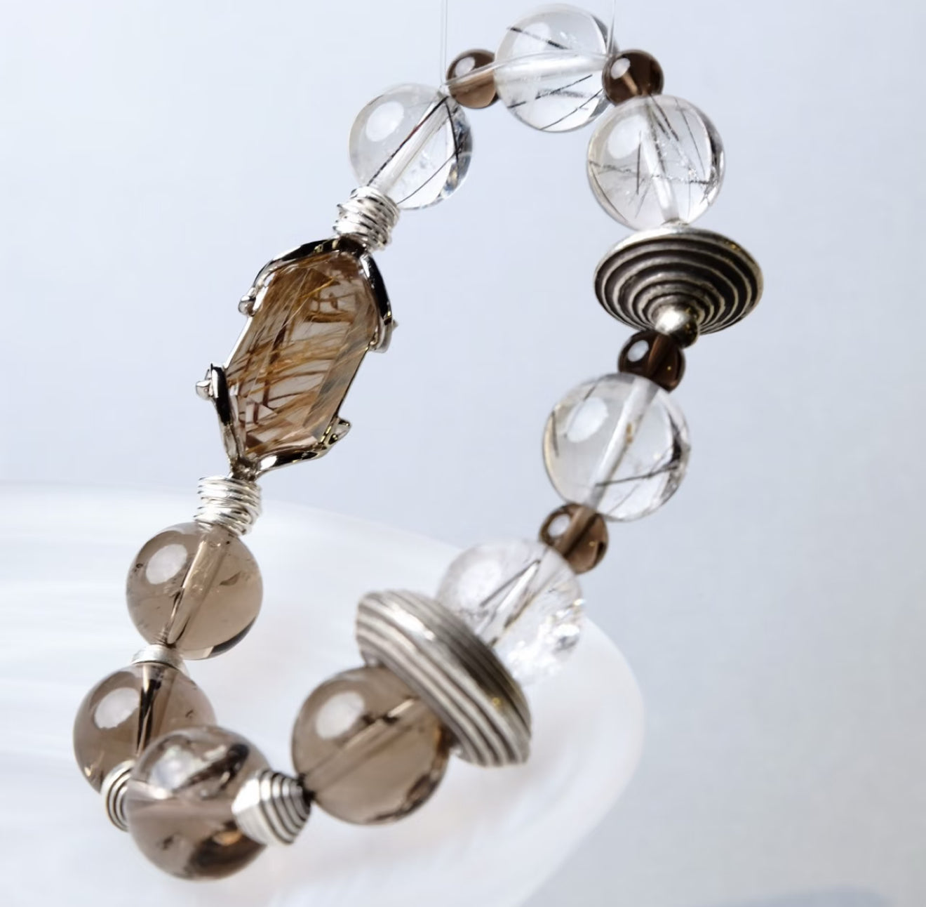 Clear Quartz with Rutile Inclusions: Known as the “Illuminator,” clear quartz amplifies intention while the golden rutile threads boost mental focus and manifestation power.