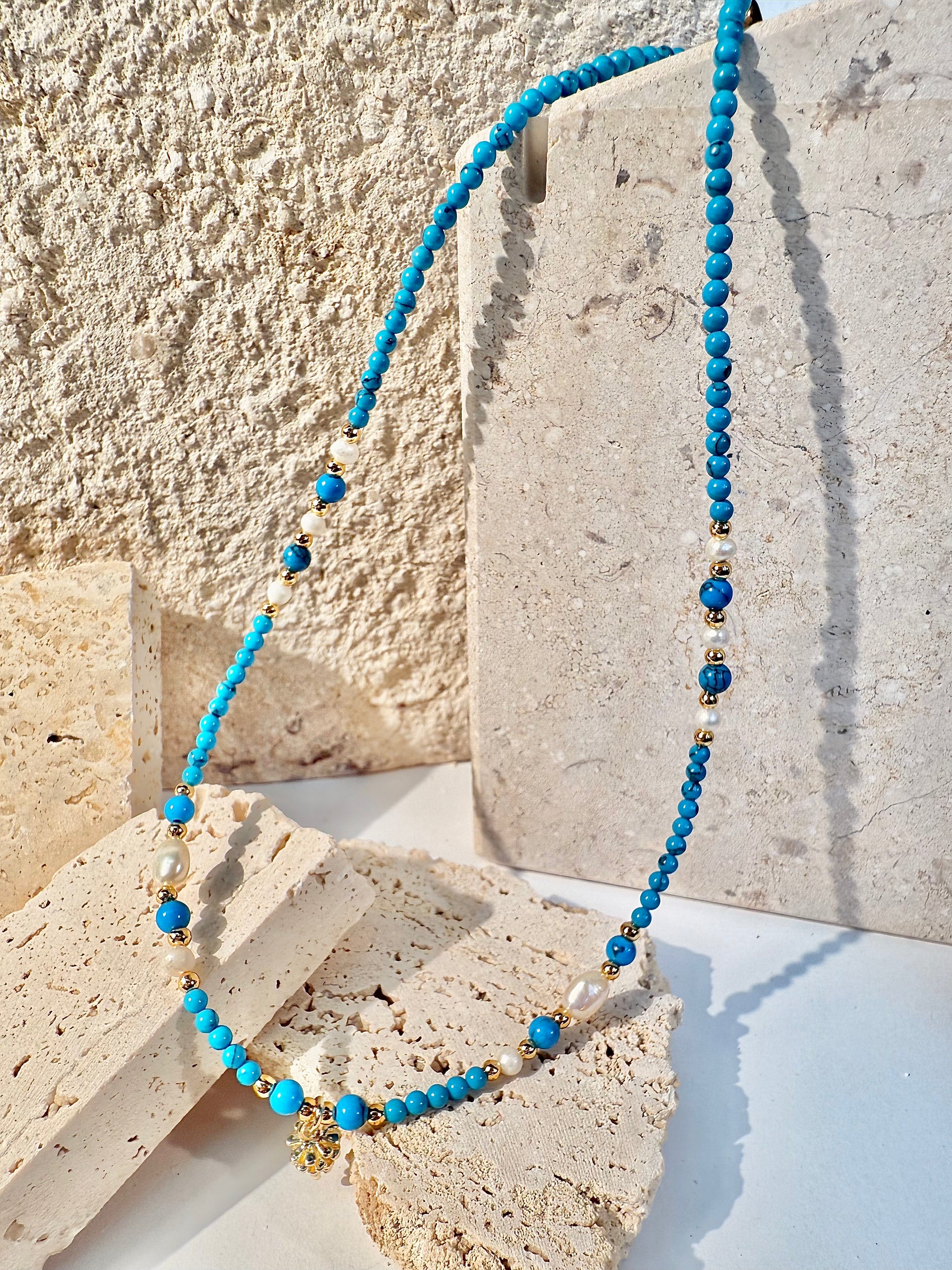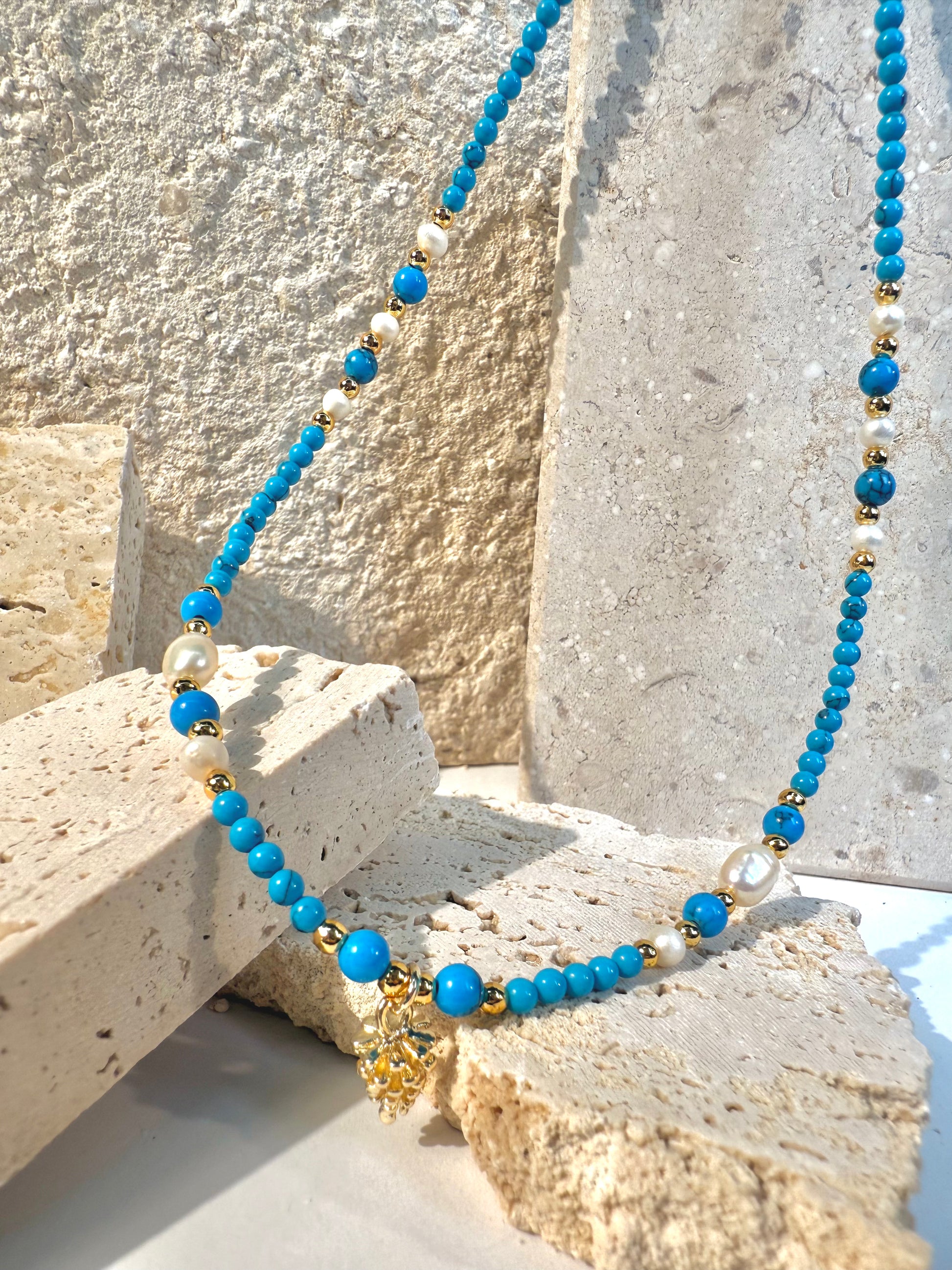 Add a touch of timeless beauty to your collection with this exquisite necklace, handcrafted from deep-blue lazurite gemstones, lustrous freshwater pearls, and gold-plated accent beads. The rich contrast between the celestial blue of lazurite, the natural glow of pearls, and the radiant warmth of gold creates a piece that is both elegant and meaningful.