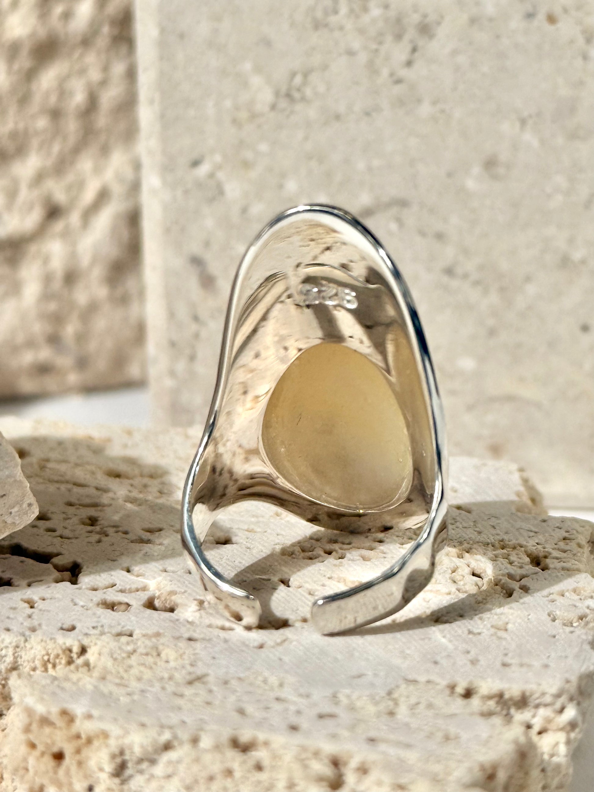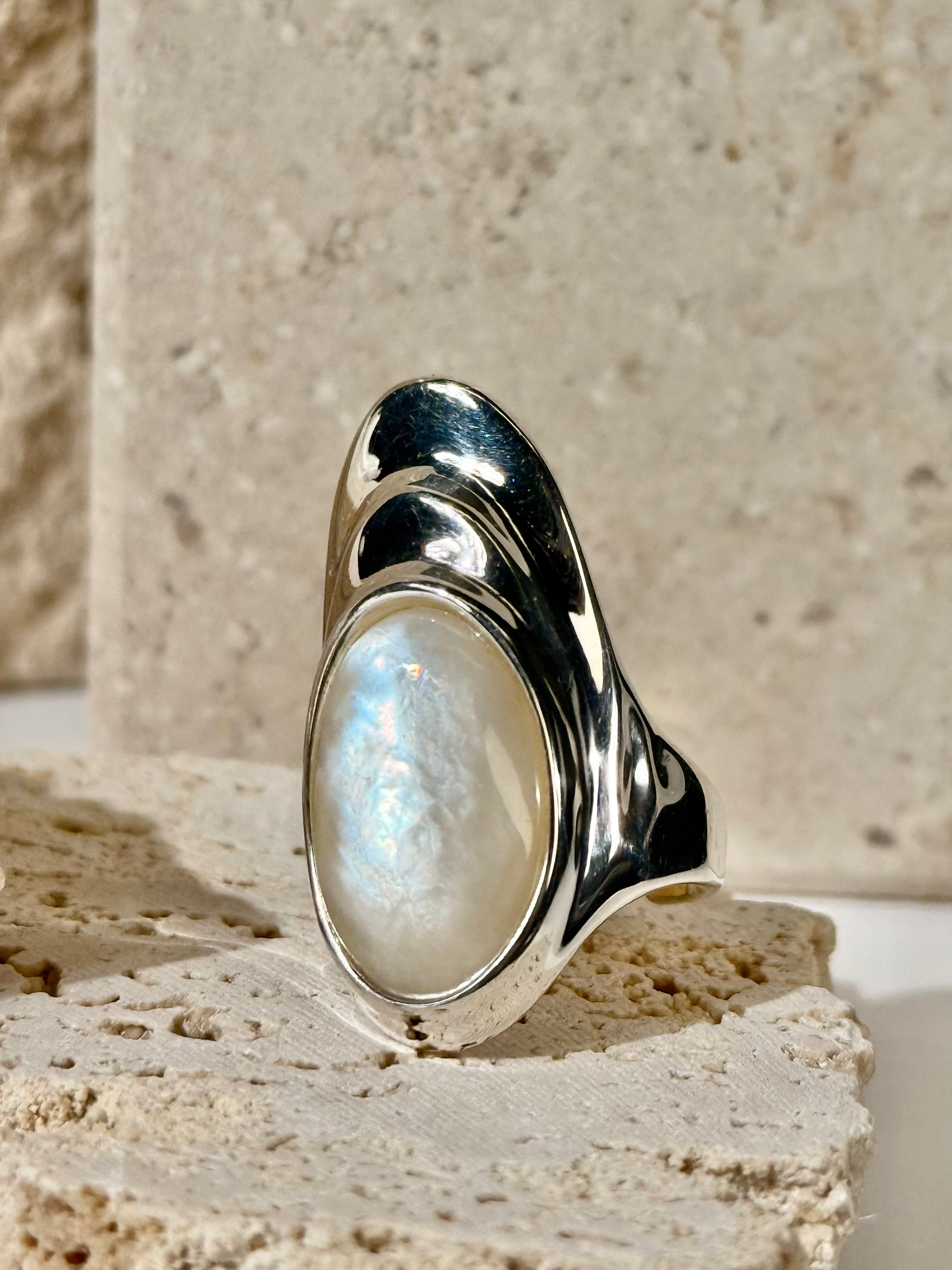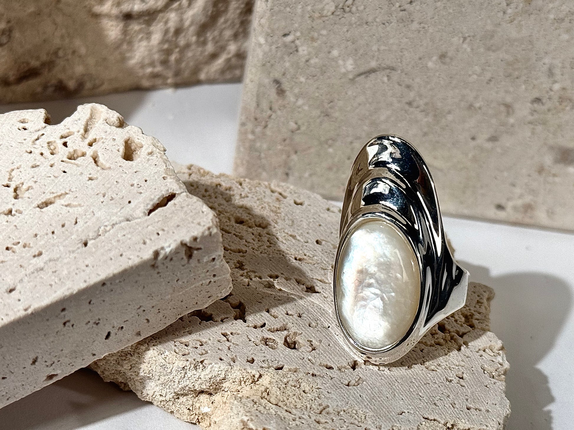 Introduce a touch of timeless sophistication to your workday wardrobe with our Mother-of-Pearl Statement Ring. Handcrafted in polished 925 sterling silver, this elegant piece features a luminous oval mother-of-pearl centerpiece that catches the light with every gesture. Designed for the modern professional woman, it’s equally at home in the boardroom or at an evening networking event.