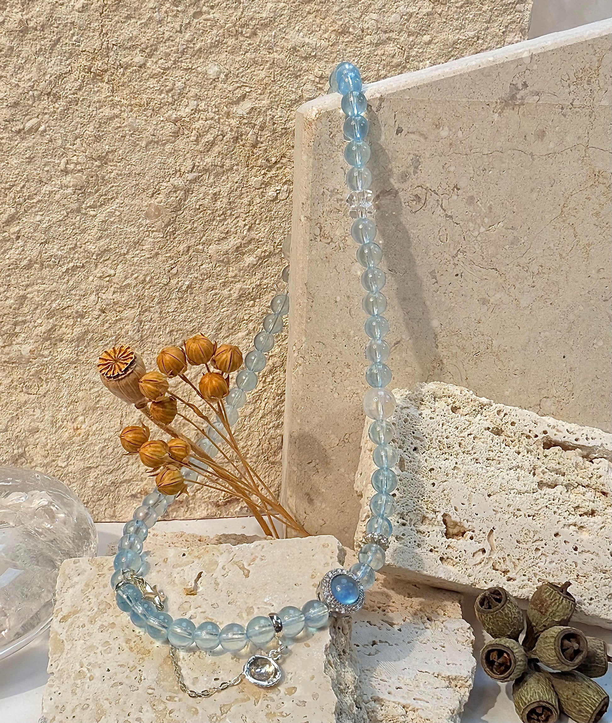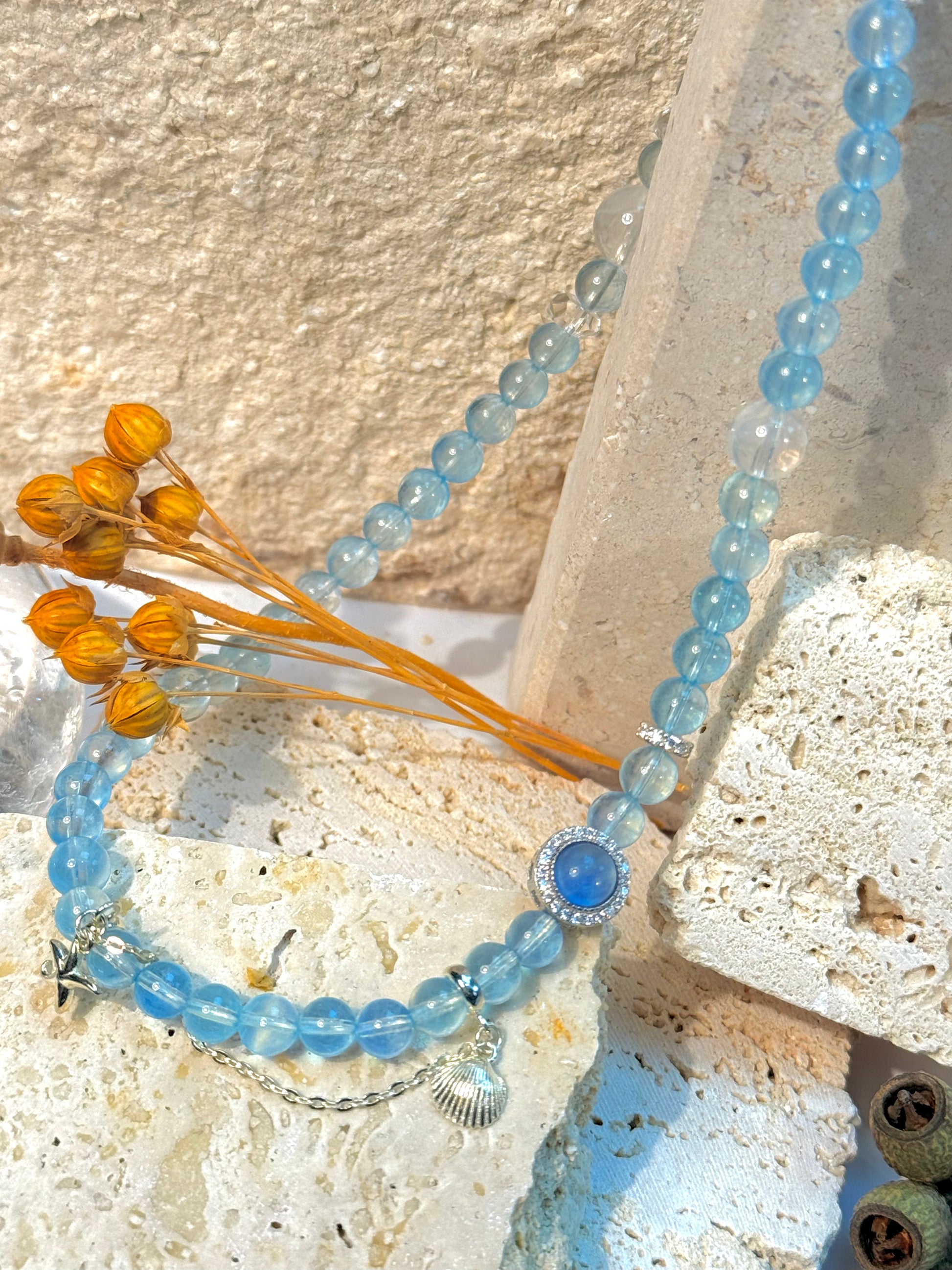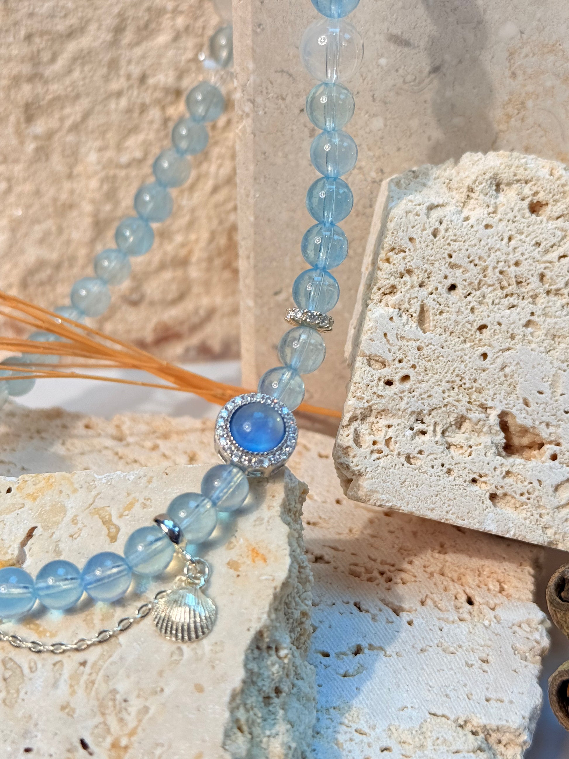 -Aquamarine: Traditionally associated with calm, clarity, and harmony. Its soft ocean-blue tones make it a favorite gemstone for peaceful energy and timeless beauty.