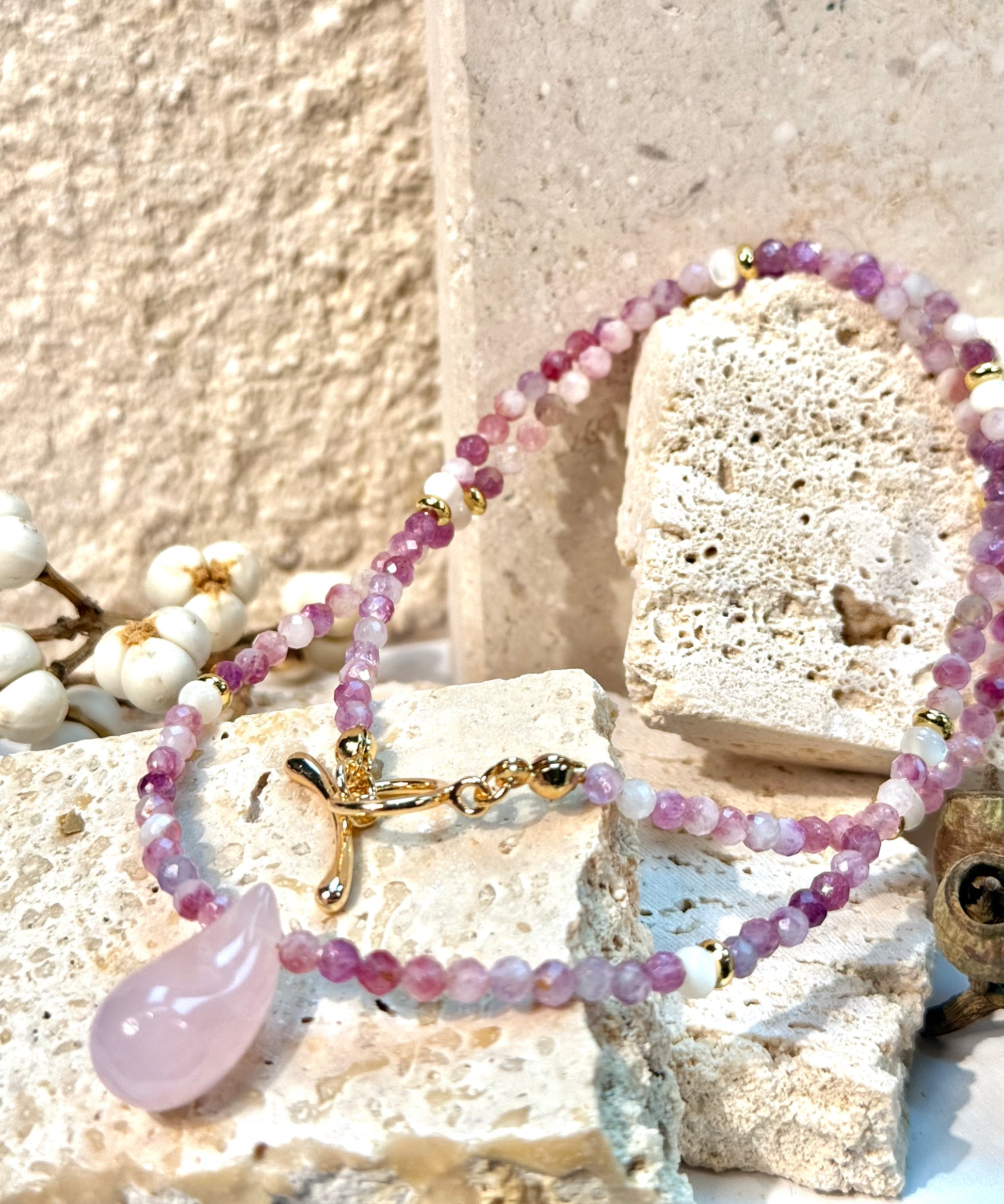 Elegant and meaningful, this Rose Quartz & Amethyst Necklace combines the soft pink glow of a rose quartz drop pendant with the deep purple beauty of amethyst beads. Handcrafted with care, the necklace blends two beloved crystals into a design that is both stylish and timeless.
